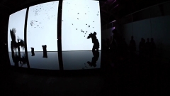 The work consists of three 30-foot high white panel frames suspended from the ceiling on which digitally captured shadows are reprojected. A shallow reflecting pool sits between the viewers and the screens. In the background, an openFrameworks application utilizes the Microsoft Kinect SDK for Windows. This talks to a front end running Unity3D in which articulated 3D models of birds interact with the shadows captured by three hidden Kinects.